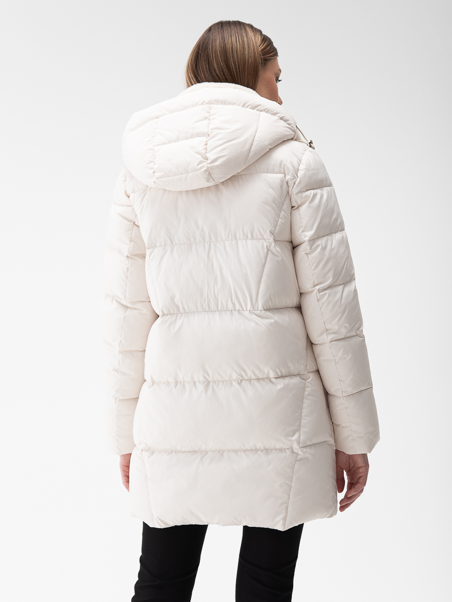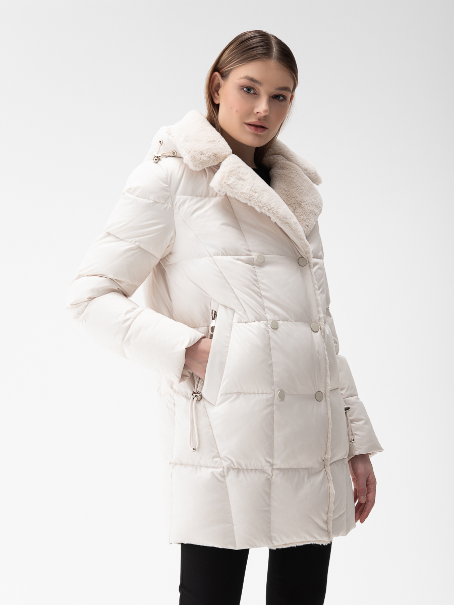 Крой воротника - съёмный капюшон, отделка эко мех
