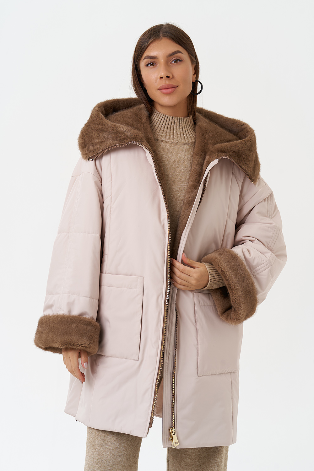 Крой воротника - капюшон, отделка эко мех под норку